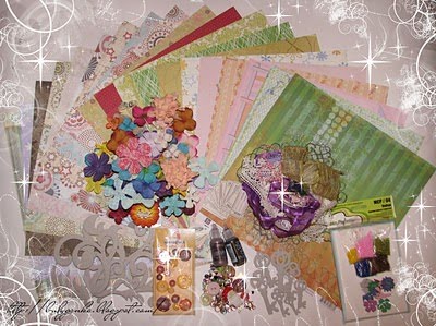 Мне от Леры и скрап-шопа пришла сюрпризная посылочка: цветочки (кое-что уже успела отковырять)), украшения и лист скрап-бумаги (30*30) от Prima, и пять листов (30*30) от Webster Pages (вся скрап-бумага двусторонняя)