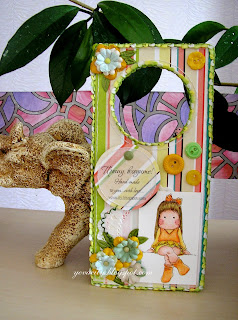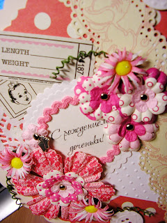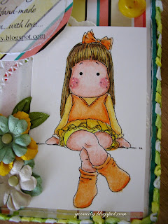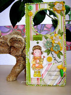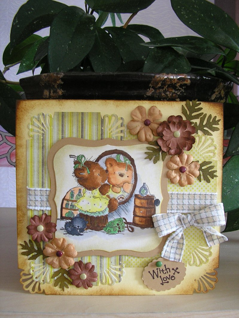 Сегодня получила посылку с обменными скрап-полезностями, а полезностей просто уйма, это и отштамповки, и надыроколенные бабочки-сердечки-листочки, пуговки, брадсы, стразики, теги, очень много красивых надыроколенных бордюров, замурчательные ленточки, салфетки для декупажа....но среди всех этих богатств была замечательная открытка! С Мишкой-малышкой, маленькой модницей! Штампик раскрашен как оказалось Copic-ами - в живую увидела как они выглядят на бумаге)