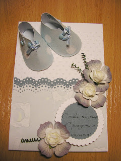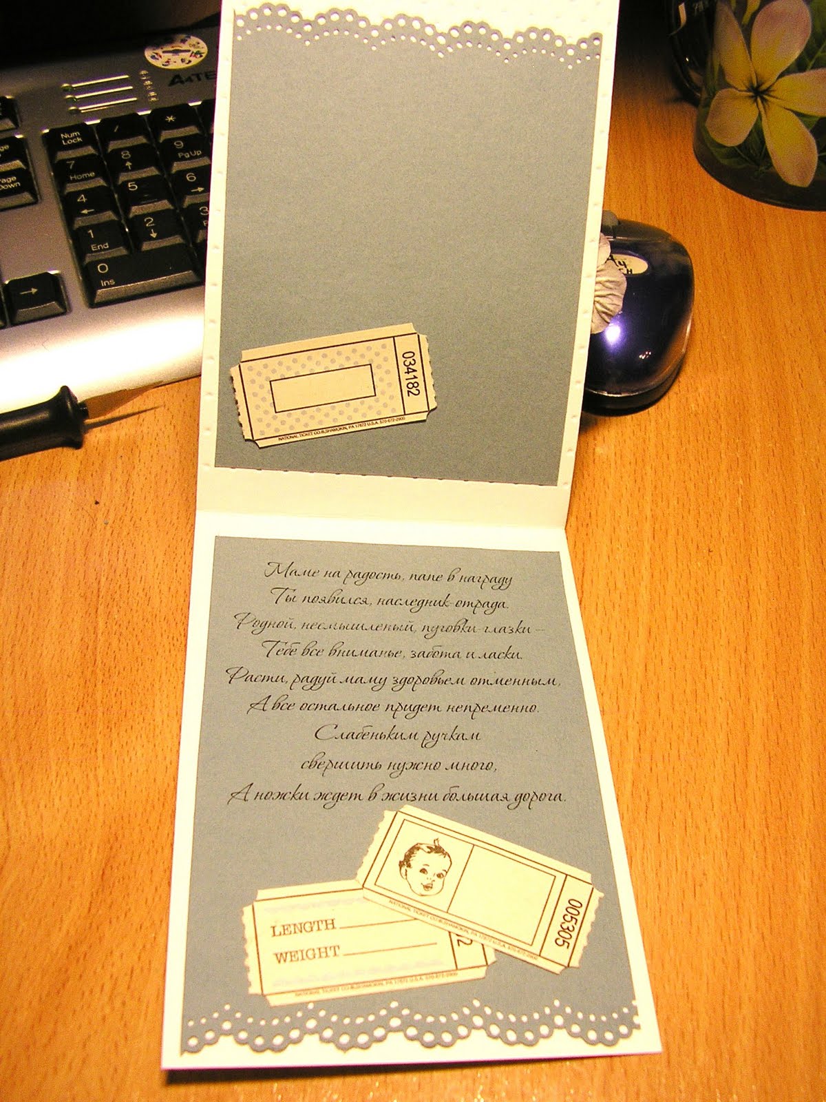 Или открытка с рождением малыша-мальчика.10*14,5 см..(из-за ночных фото конечно голубой цвет немного искажен - но у меня не хватает терпения ждать до завтра чтобы сфотографировать))