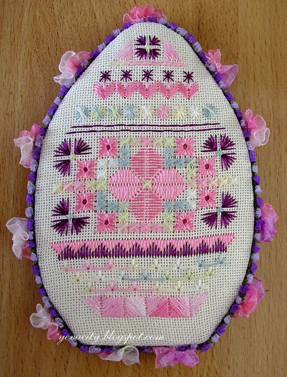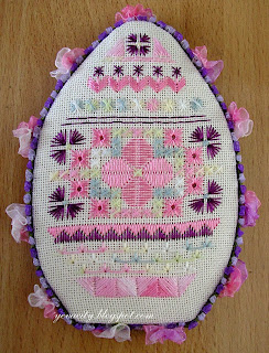 хих...а теперь позор на мою седую голову...или как первое яйцо обязательно всмятку..)) ну вот как-то так))..первый раз делала сию штуку - пинкип..теперь знаю что и синтепон в 3 ряда тонковато, и что перекос проверить бы надо до того как все заклеено клеем моментом..итак - яйцо, начатое в пасхальной авантюре (не прошло и полгода после Пасхи))..соблазнилась на спецстежки, вышито на равмномерке мадейровским мультиком и дмс-овскими шелками через 1 нитку