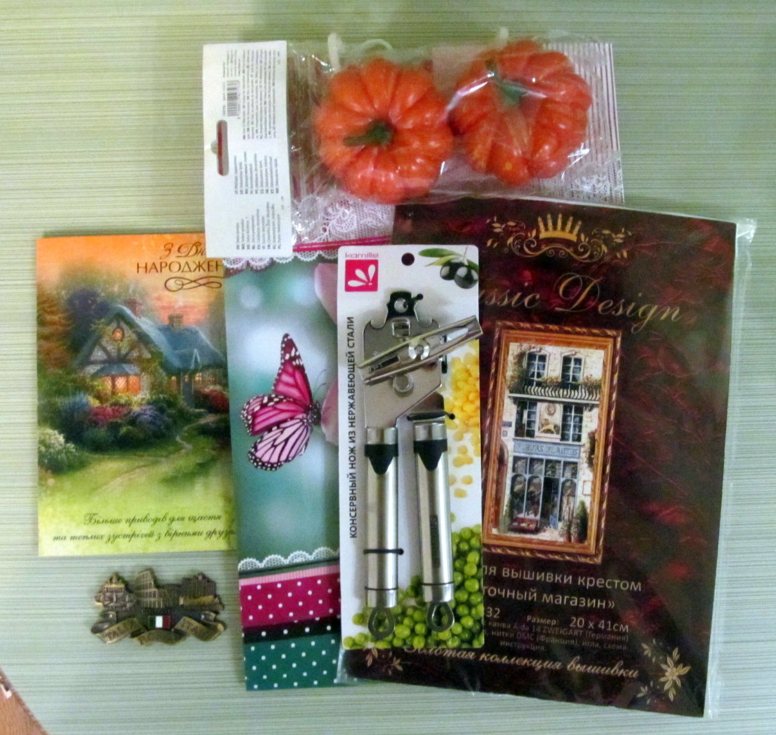 Анюта к замечательному подарку приобщила еще сувениры из поездки в Италию и личный мой заказ 😃 - универсальный консервный нож. А подарочки таковы: открытка с душевными словами, декоративные тыковки, магнитик с Римом и набор для вышивания от Classic Design (аналог Dimensions) "French Flower Shop".